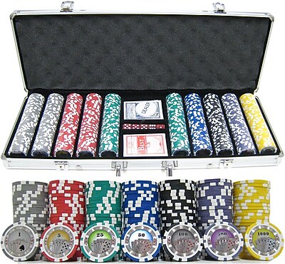 ''Casino Royale with Laser Effects'' style Pre-packaged and cannot be customized Poker chip set includes: 500 piece - 13.5 gram clay chips